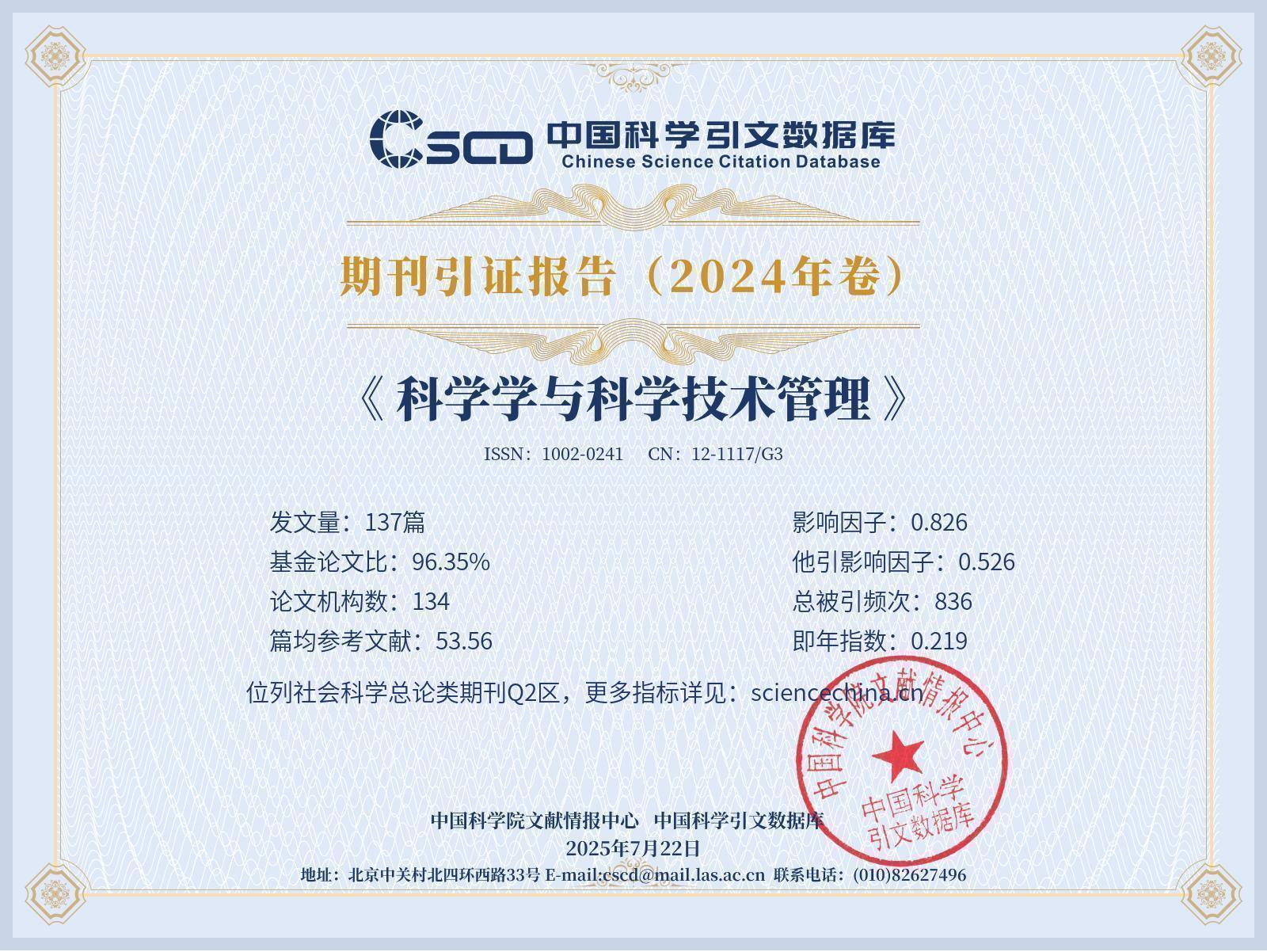 经过中国科学引文数据库(Chinese Science Citation Database,简称CSCD)定量遴选、专家定性评估,《科学学与科学技术管理》期刊成功入选2025—2026年度CSCD核心库。